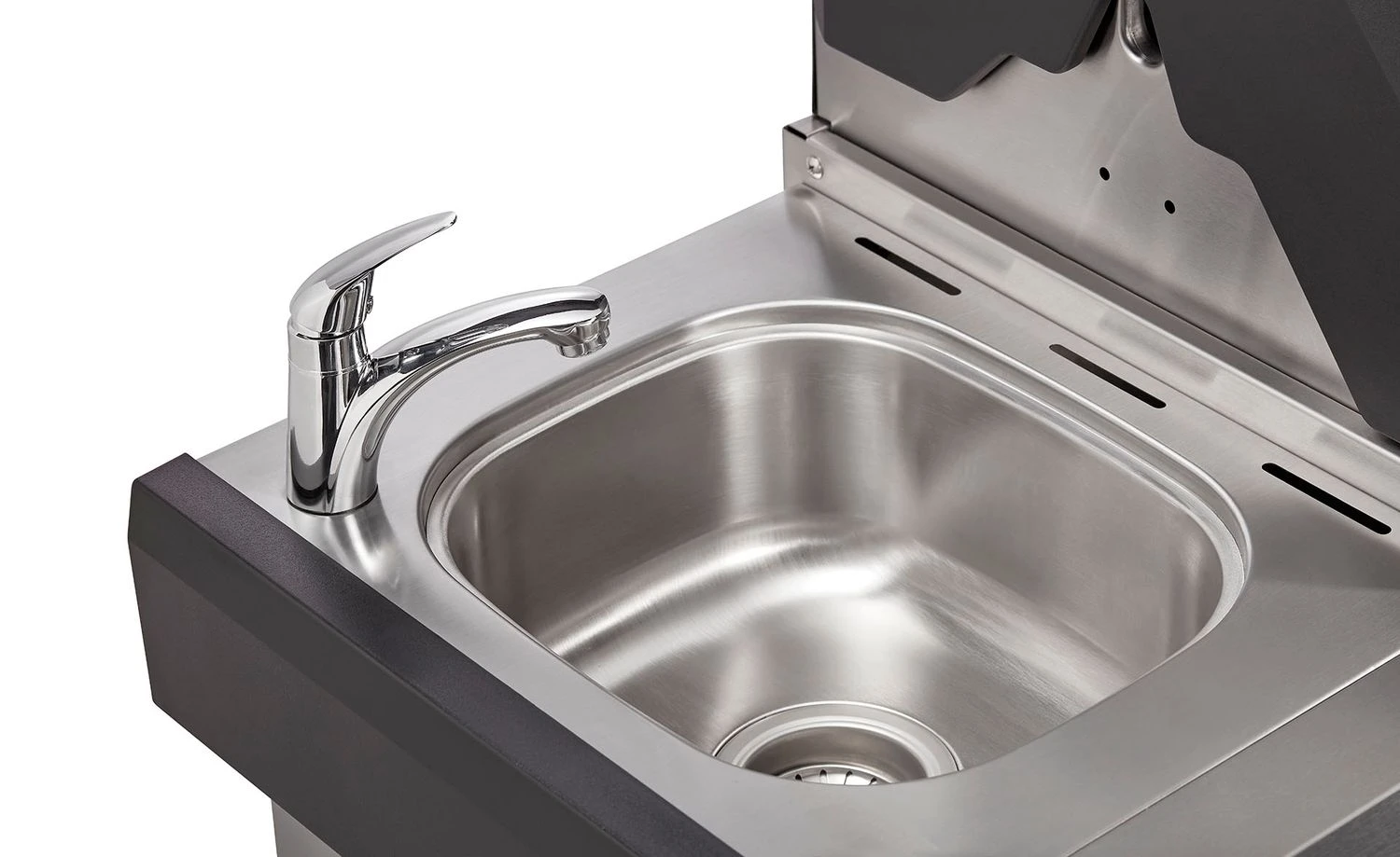 In einer vollumfänglichen Outdoorküche darf ein Spülbecken auf keinen Fall fehlen! Das in der linken Seitenablage integrierte Spülbecken aus Edelstahl spart die Wege nach drinnen zur Einbauküche. Mal eben schnell die Hände säubern, die Grillzange abspülen oder den Salat waschen: Mit dem Enders Kansas II Pro 4 kein Problem.