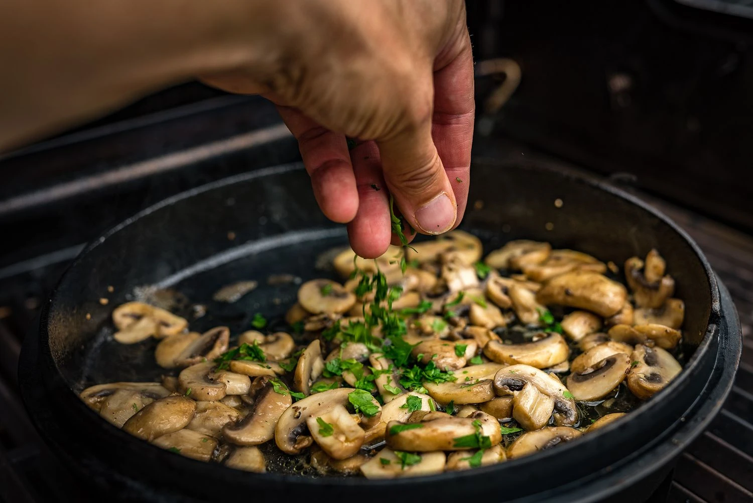 Besonders praktisch: der Deckel des Grillfürst Dutch Oven lässt sich umgedreht als praktische Gussplatte oder Grillpfanne verwenden. Hier lassen sich leckere Gemüsepfannen zubereiten, Steaks braten, Pancakes backen oder direkt das Frühstück mit Spiegelei und Bacon zubereiten.