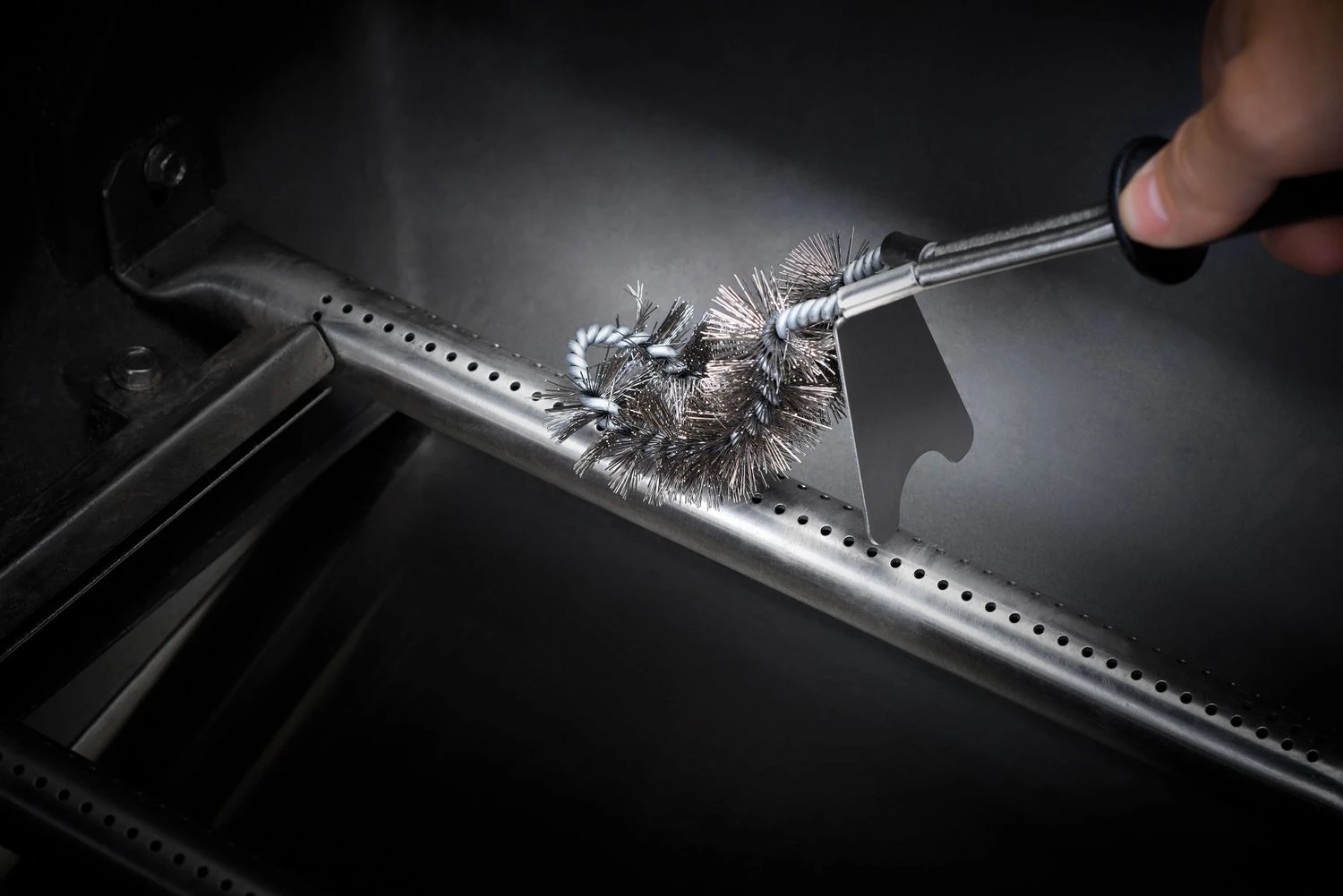 - Reinigungsbürste mit Edelstahlborsten und integriertem Grillrostschaber zur Reinigung der Edelstahl-Grillroste