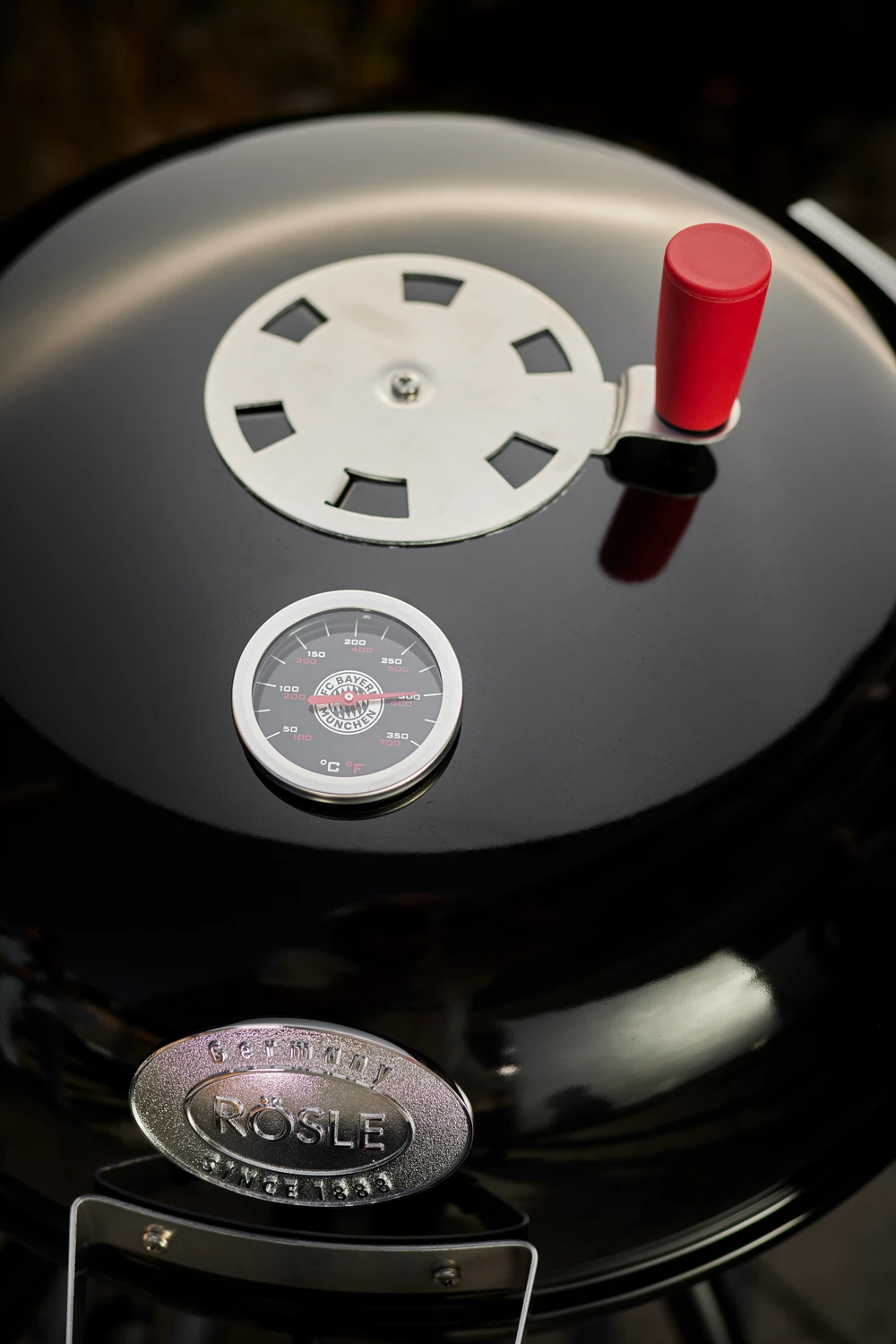 Der hohe Deckel bietet einen großen Garraum und Platz für Zubehör wie Rippchenhalter oder Hähnchenhalter um Beer-Can-Chicken zuzubereiten. Mit dem eingebauten großen Thermometer inkl. FC Bayern Logo können Sie so auch die Innenraumtemperatur einfach kontrollieren.