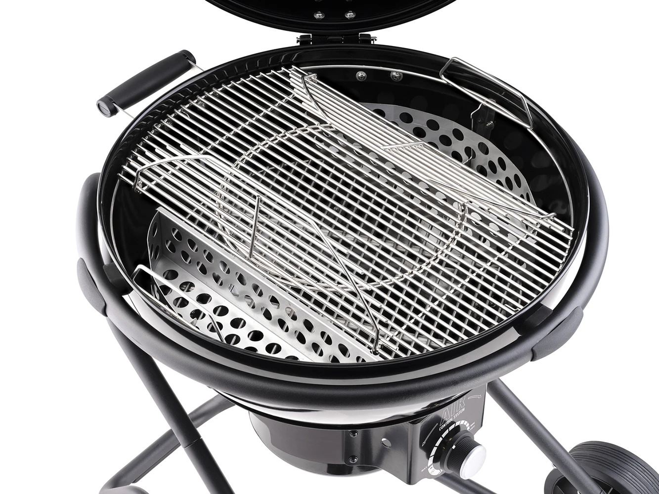 Das AIR Control System lässt sich im wahrsten Sinne des Wortes im Handumdrehen steuern. Hierfür befindet sich unterhalb der Grillkugel auf Höhe des Aschebehälters ein großer Drehknopf, mit dem sich die Menge der Zuluft ganz einfach regulieren lässt. Zusammen mit dem mit dem gut ablesbaren Deckelthermometer können sie die Temperatur im Inneren immer exakt den Bedürfnisse anpassen. Der Drehknopf des AIR Control Systems dient auch gleichzeitig auch als Entriegelung für den Aschebehälter. Dieser lässt sich mit nur einem Dreh ganz einfach entnehmen und reinigen.